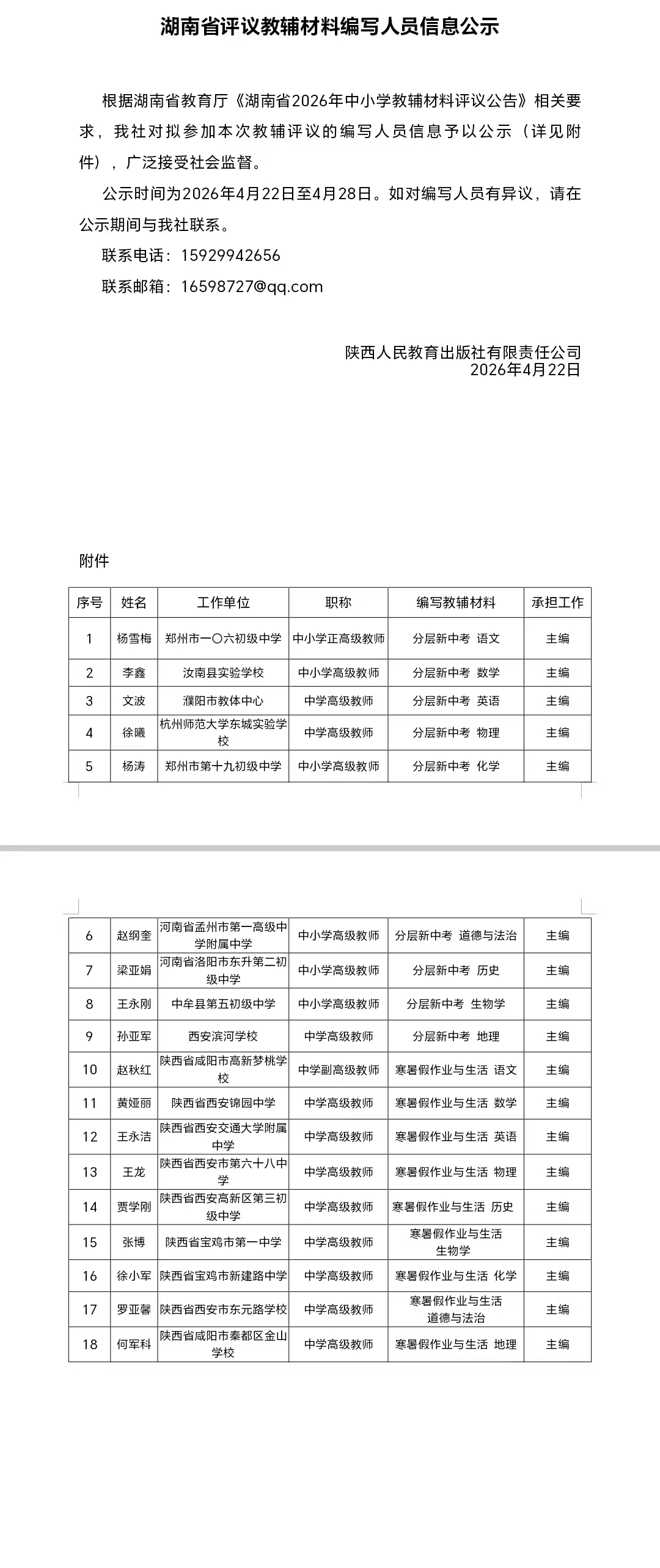 湖南省评议教辅材料编写人员信息公示